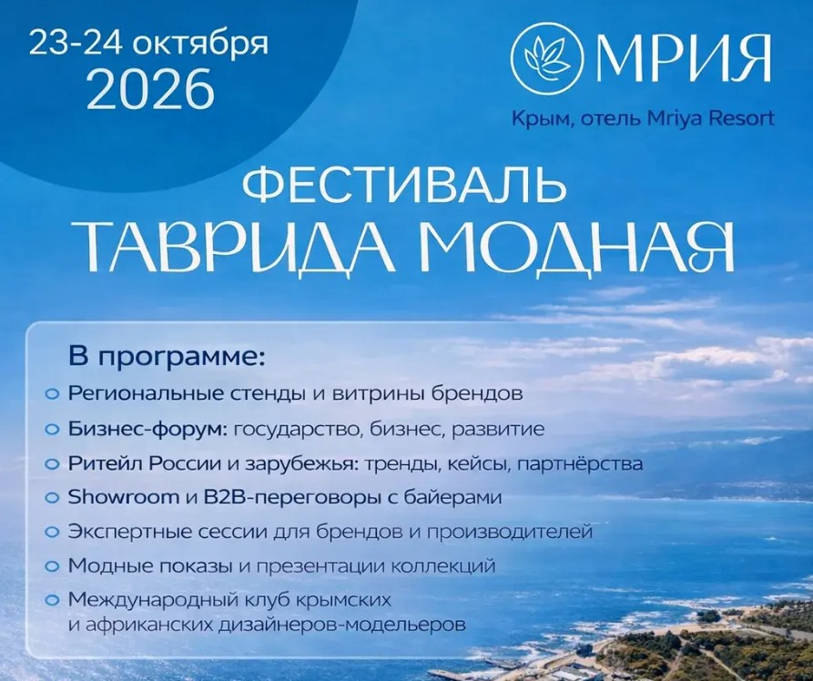 В период с 23 по 24 октября 2026 года на площадке Mriya Resort Республики Крым состоится фестиваль «Таврида Модная».